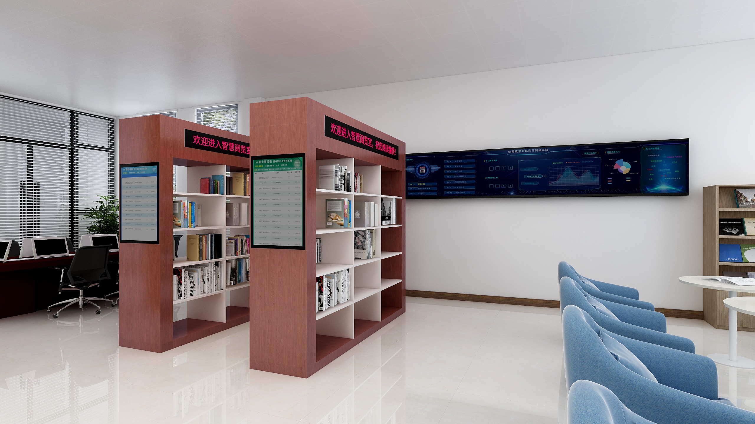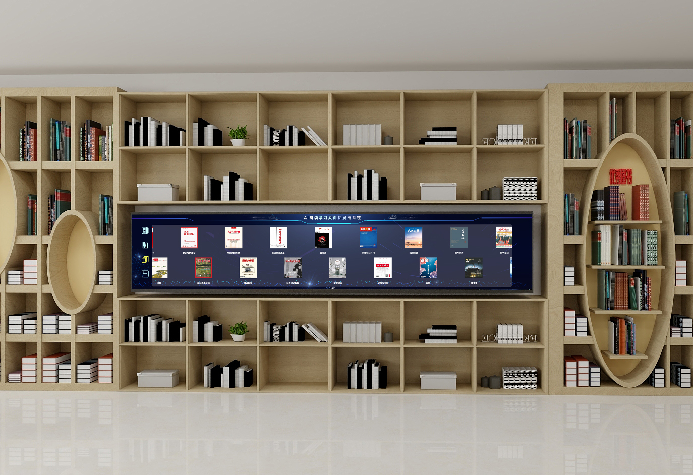 AI新上架書柜兩側都配置有觸摸顯示屏,運行《AI新上架書圖書知識點查閱系統》,用于查看書柜中每本圖書的上架來源數據,包括:被閱讀圖書、檢索出對應的新書、新書知識點的點擊次數和閱讀時長,書籍的上架時間等數據,方便讀者更加了解此書的上架必要性,更加全面的了解此書中重點突出的知識點,更加有利于閱讀學習此書。該同時支持讀者登記自己希望增加的新書信息,由圖書館管理人員負責審核購買。方便采購高頻學員真正需要的熱門書籍。 同時集成聯動1000本電子圖書、100種期刊、20種報紙及具有圖書檢索、公告、視頻、熱門書推薦、推薦知識點查閱、學員個性化學習、隨走隨薦隨學等功能。 AI新上架書系統和AI常看書系統存在一種輸入、輸出關系,AI人工智能閱覽系統統計出讀者的常看圖書,通過AI人工智能檢索系統在各家紙書供應商的最新書目、圖書內容中檢索出對應的知識點內容,再通過讀者對點擊相關文章的熱度,分析出哪些新書上的知識點比較多,而且是讀者所需要的,從而為圖書館提供一個購買新書的決策圖書目錄,圖書館依據此書目進行購買,然后上架在該書柜中。