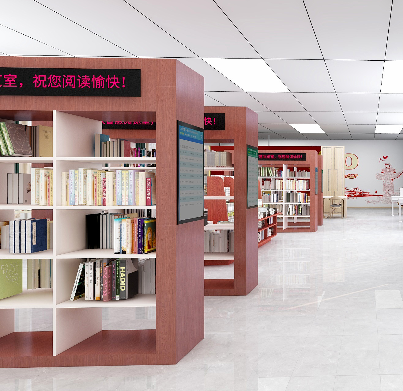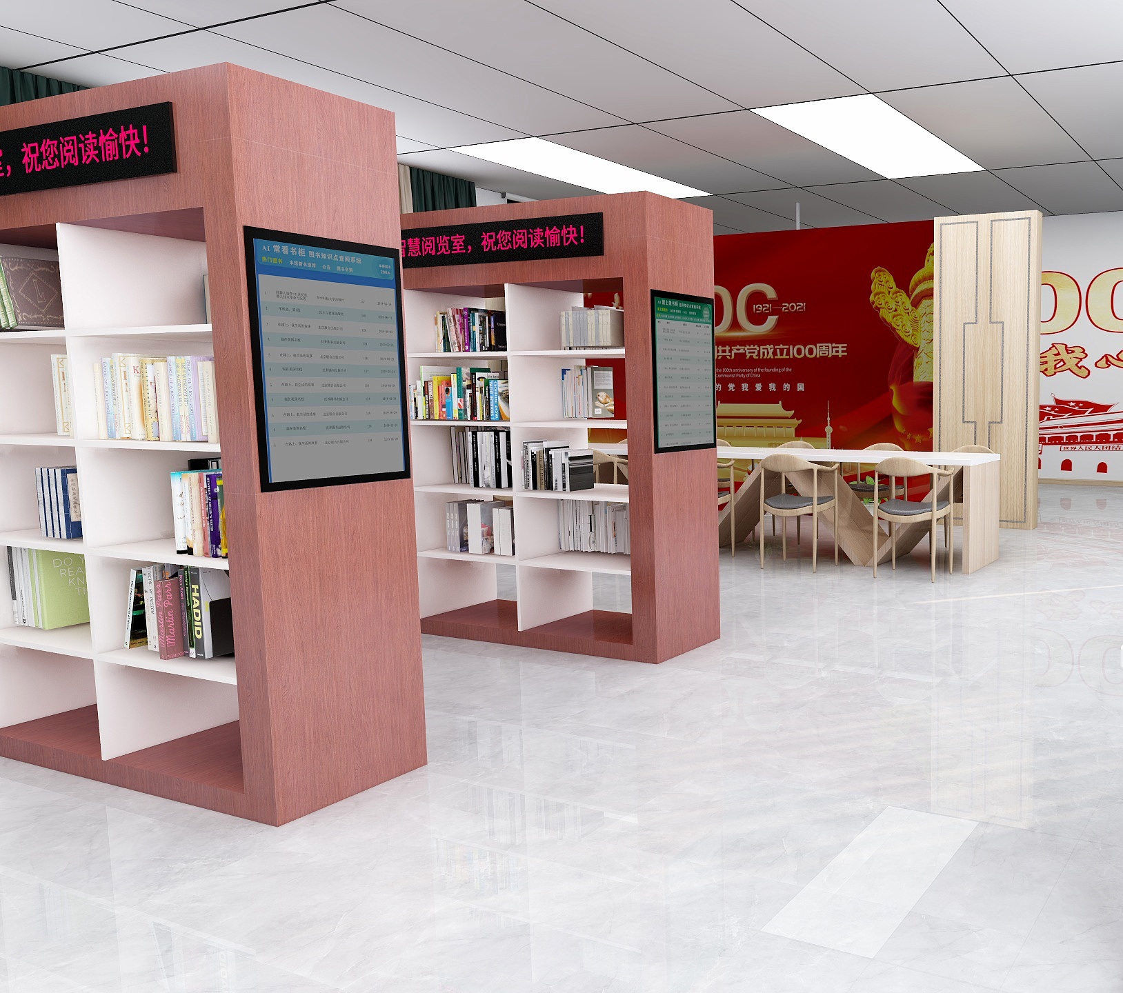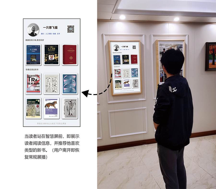 在圖書館內的墻面上掛上AI交互智慧屏,通過跳馬燈的形式展示相關的油畫、校史資料、活動展播或人物資料,給參觀者一種視覺上的沖擊,使人更容易進入一種沉浸式欣賞場景。當讀者站在AI交互智慧屏前時,會有攝像頭對其進行人臉識別,AI交互智慧屏上將會呈現眼前讀者在圖書館內的閱讀軌跡以及為讀者推薦相關圖書、報紙、期刊、數據庫條目,讓讀者獲取到更多的知識服務。AI交互閱讀智慧屏可以放置于學生宿舍、食堂或教室走廊等人流處,隨走隨薦隨學、校史展播、活動展播、藝術作品展播、營造沉浸式閱讀場景,讓學員隨時隨地感受智慧圖書館文化場景,走出圖書館服務于全校師生。