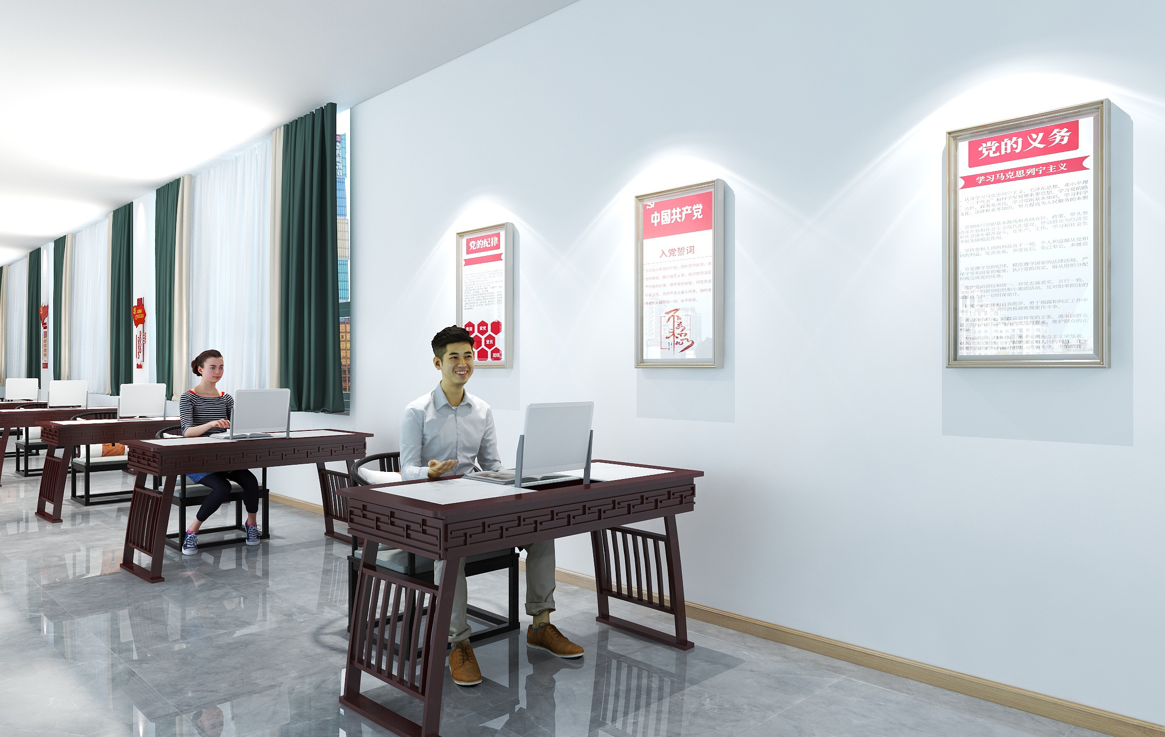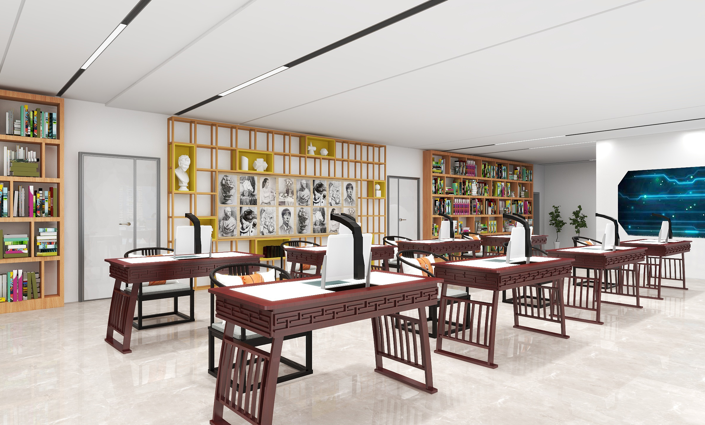 AI閱讀研討空間系統主要是解決閱讀過程中碰到的難題與問題,每一個閱讀者自身都具有不同的專長,而且每個人的知識文化是多元化的;當不同領域、不同文化的人聚集到一起的時候,在學習探討的過程中,一起分享各自碰到的難題與問題,不斷學習、不斷攻克,集合所有人的力量一起出謀劃策、共同進步。解學習難題、攻課題難關、是讀者學習社交的寶地,并提升到館率。 AI閱讀研討空間以六人坐或八人坐為標準,棱形座位或者長條形樣式,以六個方向六片屏或八片屏為主,每個座位對應一片觸摸顯示屏,每個觸摸顯示屏運行一套《AI閱讀研討空間管理系統》,每個屏幕上一半顯示的自己的難題,另一半顯示的是大家的難題和目前討論到的流程位置。